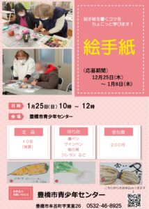 1/9追記:電話にて追加募集です。12/25(木)から、ちょこっと講座「絵手紙」の受付を開始します。 絵手紙を書くコツをちょこっと学びます。 開催日:1/25(日曜日)時 間:10:00~12:00対 象:どなたでも定 […]